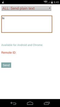Sends text to all your Android devices and Chrome browsers with the same Remote ID. No sign-up or log-in needed, just open the app. On any Chrome/Android device you can easily remote text, beep sounds, speak text.