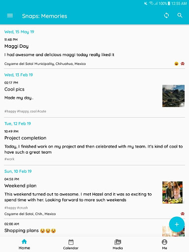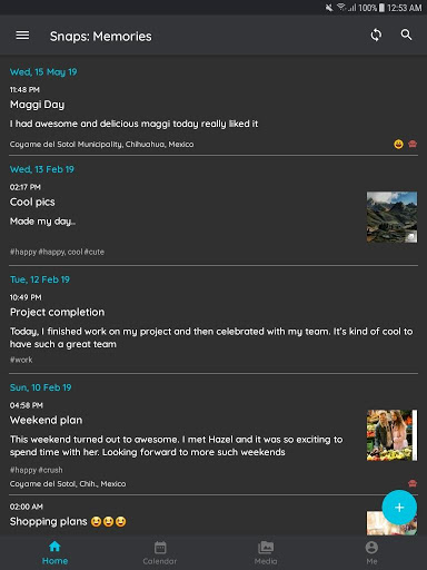 คุณสามารถใช้แอป Snaps เป็นวารสารอาหาร, วารสารภาพถ่าย, วารสารฟิตเนส, ไดอารี่ลับ, ไดอารี่เดินทาง, โน๊ตบุ๊ค, วารสารความกตัญญู, วิดีโอไดอารี่วิดีโอ ไดอารี่อาหารการติดตามอารมณ์หรืออัลบั้มรูป