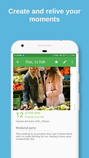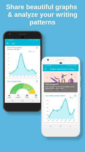- ตัวติดตามอารมณ์, ติดตามกิจกรรม, การติดแท็กกิจกรรม และข้อมูลสภาพอากาศเพื่อให้ทุกรายการที่หลากหลายและมีประสิทธิภาพ - ตัวเลือกการพิมพ์ล่วงหน้าและการแชร์เพื่อแชร์รายการของคุณในรูปแบบ PDF, ZIP และ TEXT / MEDIA รวมถึงการรวม Google Fit กับการวิเคราะห์ข้อมูลแคลอรี่และขั้นตอนของคุณ