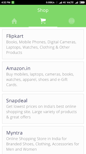 #Amazon,Flipkart,Snapdeal,Paytm,Alibaba,Shopclues,Zoomcar,Myntra,Jabong,Basicslife,Yebhi,Croma,Ajio and over 200 of shopping sites.