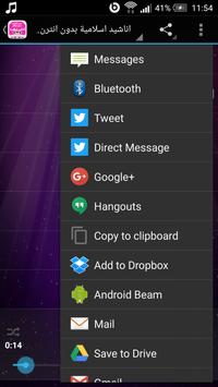 بمكنك الإستماع إلى الأناشيد بينما تعمل في تطبيقات أخرى او يمكنك وضع الهاتف جانبا و الإستماع للأناشيد الإسلامية بدون موسيقى و بدون إيقاع بينما تقوم بأعمال أخرى. ويمكنك إرسال هذه الأناشيد إلى أصدقائك وعائلتك كما يمكنك أيضا مشاركتها على مواقع التواصل الإجتماعية كالفيس بوك و تويتر و إنستغرام.