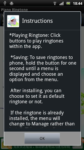 Piano Ringtones include 42 interesting media,using simple interface and convenient operation and can install as phone ringtone,SMS ringtone and Alarm ringtone.Features:Playing Ringtone: Click buttons to play ringtones within the app Saving: To save ringtones to phone, hold the button for one second until a menu is displayed and choose an option from the menu.After installing, you can choose to set it as default ringtone or not.If the ringtone is already installed, the menu will change to Manage rather than install. This option allows you to uninstall or set as default ringtone.Notifications: For notifications, only the system wide DEFAULT notification can be set. You may have apps which individually choose alternate notifications rather than the default. For example, in Gmail go to menu- gt;more->settings and choose "Select ringtone". Anything other than "Default ringtone" being set here will override the notification setting set within the Sound app. To enable the notification set by the sound app, choose "Default ringtone" within the application in which you wish the notification to apply.Press Menu:Introduction: Detailed description of the use of the app.Share: You can share this app to everyone through SMS、E-mail、facebook or twitter.More: More interesting ringtone offer to you. Uninstall: Uninstall all the ringtones of the app.Exit: Exit the app.Rate: If you like this app, please give us good Rate. Otherwise, please give some suggestion by mail.English, Chinese (simplified / traditional), Japanese, Korean four languages