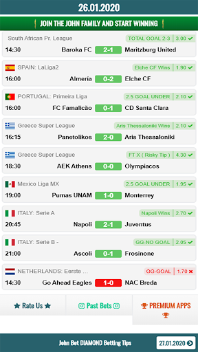 ใน John Bet Diamond ของเรา แอปพลิเคชันมีเพียงเคล็ดลับการเดิมพันฟุตบอลเท่านั้น เรากำลังวิเคราะห์ 40 ลีกในโลกและให้คำแนะนำแก่คุณ เราให้คำแนะนำอัตราต่อรองสูงพิเศษทุกวัน เราชนะมากและเราต้องการให้คุณชนะเช่นกัน