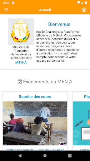 Intello Challenge, la Plateforme officielle du MEN-A. Vous pouvez accéder à l'actualité du MEN-A et des écoles, des cours, des exercices, des jeux et bien d'autres ressources éducatives à partir d'ici. Il vous suffit d'un compte pour accéder à votre espace personnalisé.