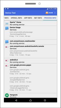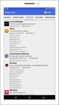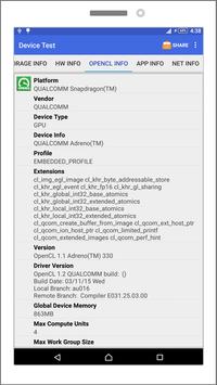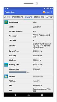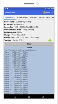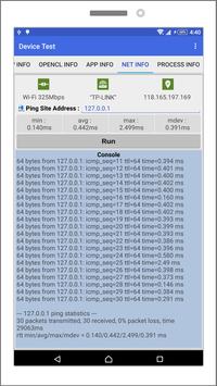 Device Test provides screen refresh rate by FPS(Frames per second), storage information, platform information, OpenCL runtime information, Installed App List with native libraries, and simple ping tool.