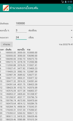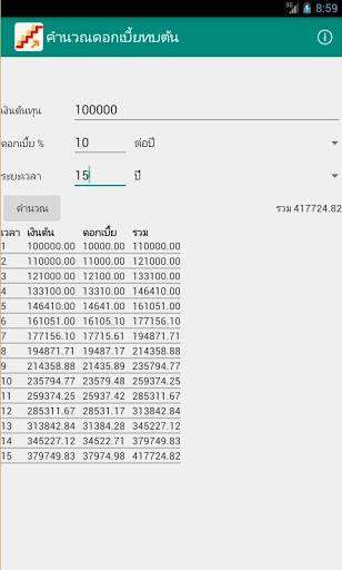 ใช้คำนวณดอกเบี้ยทบต้น เผื่อดูผลกำไรที่ได้รับแต่ละงวดในแต่ละเดือนปี สามารถใช้ได้ทั้งแบบดอกเบี้ยรายเดือนและรายปี เช่น ท่านฝากเงิน 100,000 บาท ได้ดอกเบี้ยปีละ 3% ฝาก 10ปี จะได้เงินทั้งหมดรวมเท่าไร