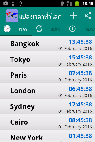 ด้วยแอพเวลาโลก ทำให้คุณสามารถทราบเวลาเมืองต่างๆทั่วโลก และคุณสามารถแปลงค่าเวลาจากเมืองหนึ่งเป็นเวลาของอีกเมืองได้ด้วย
