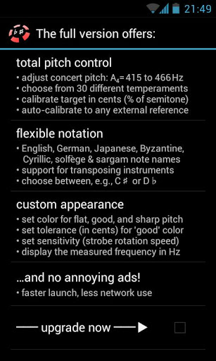 This is the free 'lite' version of linostrobe, which uses the same strobe technology as the full version but is ad-supported and uses the fixed reference pitch A₄ = 440 Hz. By contrast, the full version is ad-free and offers many adjustable settings.