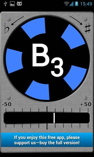 Tune your guitar, uke, violin, … in fact any musical instrument with the speed, accuracy and comfort of true strobe tuning! Simply sound the note to be tuned; it will instantly be recognised and displayed prominently. The strobe ring around it shows through its rotation and color whether you're flat, sharp, or in tune.