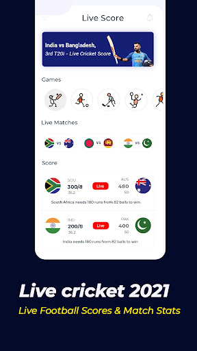 แอพมือถือคะแนนคริกเก็ตสดแสดงให้เห็นถึงทุกฤดูกาลคริกเก็ตระหว่างประเทศและในประเทศเช่นอินเดีย T20 ลีก IPL 2020, World T20, Champions League Twenty20, HK-T20, HK-T20, HK-T20, PSL-T20 Asia Cup, Indian T20 League 2020, Tri ซีรีส์, T20 ซีรีส์, ฟุตบอลโลก, เอเชียคัพ, ICC คริกเก็ตเวิลด์คัพ 2019, ICC บุรุษ T20 World Cup 2020, ODI และการแข่งขันอื่น ๆ