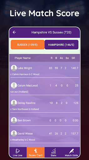 - คุณจะได้รู้จักทั้งสองทีม Batsmen และ Bowlers Live Stats ฟรี - Batsmen Live Stats - คะแนนการวิ่ง, ลูกบอลที่ต้องเผชิญ, สี่, sixes, อัตราการนัดหยุดงาน