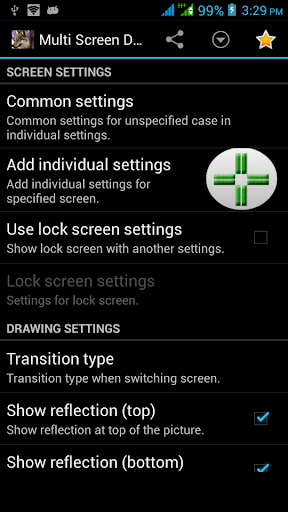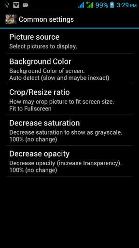 การตั้งค่าแอป: การตั้งค่าทั่วไป: - เลือกแหล่งรูปภาพเพื่อแสดงรูปภาพ (แหล่งรูปภาพอาจเป็นวอลล์เปเปอร์ภายในที่มีอยู่ในแอปวอลเปเปอร์สดหรือ เลือกจากโฟลเดอร์อัลบั้มหรือรูปภาพหรือแม้แต่เลือกภาพเดียว) เปลี่ยนสีพื้นหลังของหน้าจอ (อาจเป็นสีแดง, สีเขียว, สีฟ้า ฯลฯ หรือสีที่ตรวจจับอัตโนมัติ), ครอบตัดหรือปรับขนาดรูปภาพให้พอดีกับขนาดหน้าจอหรือพอดีกับเต็มหน้าจอลดความอิ่มตัวของภาพ (จาก 100 ถึง 10%) หรือ ลดความทึบของภาพ