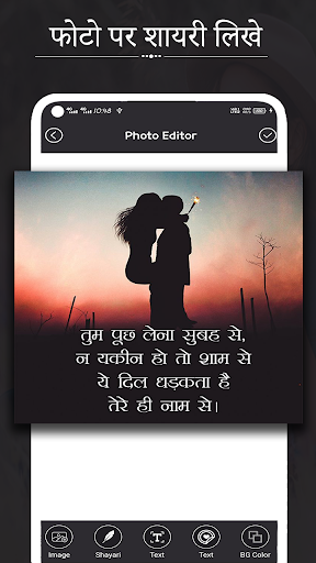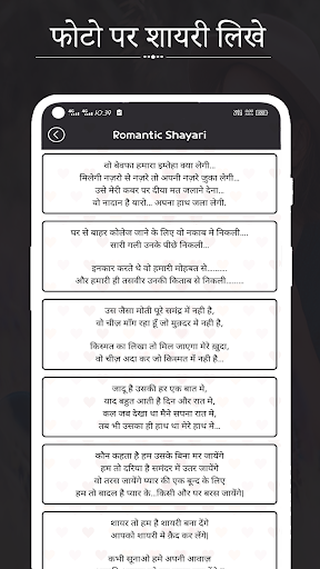 หากคุณต้องการที่จะแสดงความโศกเศร้าของความรู้สึกของคุณความรักของคุณและเรื่องราวการล่มสลายแล้วนี้เป็นหนึ่งที่จะทำผลงานของคุณ. เธเธรูปภาพ Shayari ตราไว้หุ้นละ likhna AB hain bilkul asaan คุณสามารถเขียนภาษาฮินดี Shayari เช้าวันดีคืนดีวันเกิดครบรอบ ฯลฯ Wishes ในภาษาฮินดีเกี่ยวกับภาพถ่ายของคุณหรือบนพื้นหลังที่กำหนดใน app. เธเธรูปภาพ PE Naam likhna Wala app ที่ช่วยให้คุณสามารถเขียนข้อความภาษาฮินดีได้ที่ pic เขียนของคุณเอง Shayari บทกวีข้อความสถานะ, คำคมเกี่ยวกับภาพและแบ่งปันให้กับเพื่อนของคุณ app นี้มีการใช้แป้นพิมพ์ภาษาฮินดีที่จะเขียนโรแมนติก, คำพูด, โต้ตอบเรื่องตลกหรือสถานะในรูปภาพ