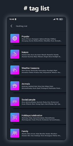 หมวดหมู่: มี 20 หมวดหมู่ให้เลือกแฮชแท็กที่คุณต้องการจาก คุณสามารถค้นหา Instagram ที่เป็นที่นิยมมากที่สุดสำหรับเซลฟี่ภาพถ่ายธรรมชาติโพสต์ที่เกี่ยวข้องกับกีฬา, วิดีโอเกม, ภาพถ่ายครอบครัว, แกดเจ็ต ฯลฯ