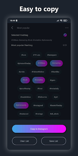 คุณสมบัติอื่น ๆ : เลือกแฮชแท็กหลายตัวคัดลอกแฮชแท็กและแชร์แฮชแท็กกับเพื่อนของคุณบนเครือข่ายสังคมออนไลน์เช่น Instagram Direct, Whatsapp, Facebook, Messenger ฯลฯ