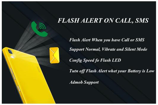 Flash Alert on Call application reminds you of a incoming call, message (SMS) and notifications with the blink of light with the use of camera Flash Light. This Application mostly use when your phone in Silent Mode or you are not hear your incoming calls, SMS and notifications ring tone.With this cool application you can see your flash light blink on incoming call or text sms. Using this app the flash light will blink when there is an incoming call, sms.One of the cool flashlight alert or flash alert application in the play store. Very useful in the dark or at night when you do not want to hear ringtones. Do you want flash on call then download this application.Flashlight alert gives you a very handy tool to get notified of all kind of notifications with just a blinking flash torch.Flash light alerts puts the power of blinking flash customization for your android phone at your fingertips. Create unique blink patterns for incoming phone calls, texts (SMS), and app notifications. For example use flash alerts for all notifications including email, social networking, and messenger apps.