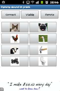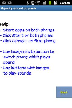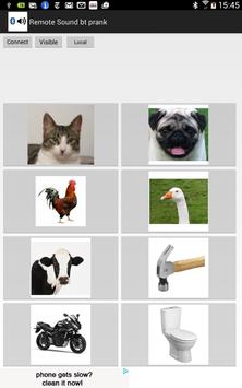 This application allows you to control other phone, via bluetooth connection, and play build-in sounds. List of sounds: cat, dog, rooster, gesse, cow, hammer, bike and toilet. Have fun