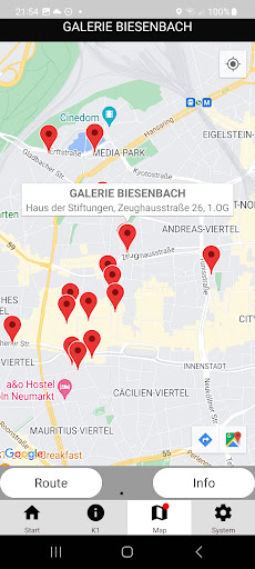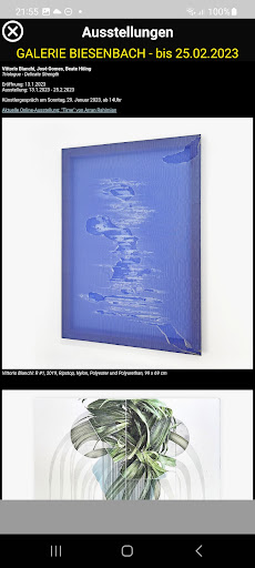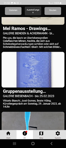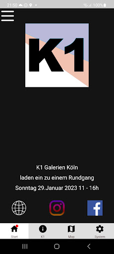 แอพนี้ได้รับการพัฒนาสำหรับผู้เข้าชมกลุ่ม Cologne Gallery & quot; K1 & quot;และให้บริการตลอดทั้งปีเป็นงานประกอบในแอพข้อมูลเกี่ยวกับแกลเลอรีที่เข้าร่วมแต่ละแห่งมีให้ในรูปแบบขนาดกะทัดรัดและยังช่วยให้สามารถเข้าถึงเว็บไซต์ของผู้เข้าร่วมได้เพื่อรับภาพที่สมบูรณ์เส้นทางไปยังแกลเลอรี่ในรูปแบบของเส้นทางสามารถแสดงผ่านตัวเลือกการนำทาง