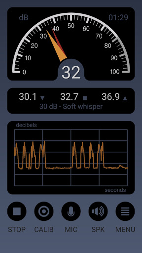 Decibel Meter เป็นแอพ Android ที่ดีที่ใช้ไมโครโฟนสมาร์ทโฟนของคุณเพื่อวัดความเข้มของเสียงโดยรอบเนื่องจากเดซิเบล (db) เป็นหน่วยลอการิทึมที่ใช้ในการวัดระดับเสียงแอปพลิเคชันของเรามีจอแสดงผลแบบอะนาล็อกขนาดใหญ่ที่มีสองมือที่สามารถแสดงค่าเดซิเบลใด ๆ ระหว่าง 0 ถึง 100 dB SPLยิ่งระดับเดซิเบลสูงขึ้นเสียงก็ดังขึ้นเท่านั้นเสียงกระซิบประมาณ 30 เดซิเบลการสนทนาปกติประมาณ 60 เดซิเบลและเครื่องยนต์มอเตอร์ไซค์ทำงานอยู่ที่ประมาณ 95 เดซิเบลเสียงรบกวนสูงกว่า 80 เดซิเบลในช่วงระยะเวลานานอาจเริ่มสร้างความเสียหายให้กับการได้ยินของคุณมือสีส้มแสดงระดับเดซิเบลปัจจุบันในขณะที่สีแดงมีความล่าช้า 2 วินาทีในการแสดงระดับสูงสุดของเสียงนอกจากนี้ยังมีเคาน์เตอร์สามตัวสำหรับค่าต่ำสุดค่าเฉลี่ยและสูงสุดของเดซิเบลและกราฟที่แสดงวิวัฒนาการของระดับเสียงเมื่อเวลาผ่านไป