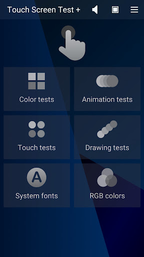 กลุ่มการทดสอบ สัมผัส รวมถึงการทดสอบแบบสัมผัสเดี่ยวสองครั้งการทดสอบและหน้าชื่อซูมและหมุนการทดสอบครั้งแรกช่วยให้คุณตรวจสอบความไวของหน้าจอสัมผัสของคุณและเพื่อระบุพื้นที่การทำงานที่น้อยกว่าในที่สุดพวกเขาจะเสร็จสมบูรณ์เมื่อหน้าจอทั้งหมดเต็มไปด้วยสี่เหลี่ยมสีน้ำเงิน - รวมถึงพื้นที่ที่ครอบครองโดยข้อความด้านบน