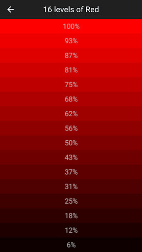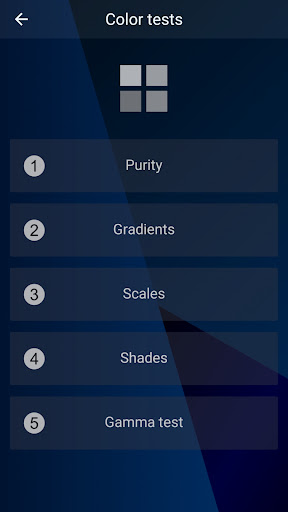 การทดสอบสี แสดงอีกห้าปุ่มอีกหนึ่งปุ่มสำหรับการทดสอบสีแต่ละครั้ง:ความบริสุทธิ์การไล่ระดับสีเครื่องชั่งเฉดสีและการทดสอบแกมม่าการทดสอบเหล่านี้ช่วยให้คุณสามารถตรวจสอบความสม่ำเสมอของสีหลักบนหน้าจอความคมชัดที่พวกเขาเสนอในระดับความสว่างปัจจุบันและดูจำนวนเฉดสีของพวกเขาการทดสอบแกมม่าแสดงชุดของเฉดสีสีที่ช่วยให้คุณค้นหาค่าแกมมา (แสดงว่าระดับความสว่างของอุปกรณ์ของคุณสะท้อนสัญญาณอินพุตได้ดีเพียงใด