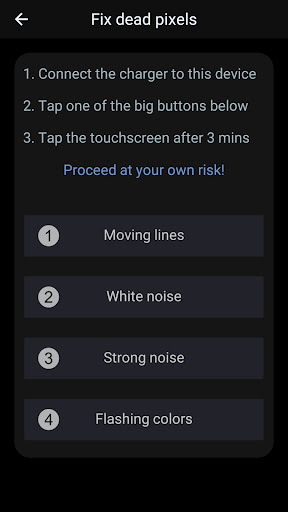 พิกเซลซ่อมแซม เป็นที่ตั้งของสี่ขั้นตอนพิเศษที่ลองแก้ไขพิกเซลที่ตายแล้วหน้าจอสัมผัสของคุณอาจมี: เส้นเคลื่อนที่เสียงสีขาว / แข็งแรงและสีกระพริบ