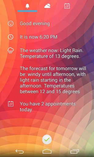 * Dismiss the alarm to a beautiful notification view: Get detailed weather and calendar information immediately after dismissing the alarm. AlarmPad can also speak that information to you.