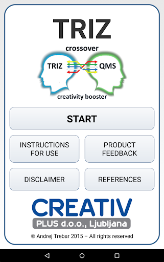 แอปพลิเคชันมือถือ TRIZ Crossover QMS ช่วยให้สามารถใช้เครื่องมือและเทคนิค TRIZ ในโลกของการจัดการคุณภาพมันได้รับการพัฒนาขึ้นเพื่อปรับปรุงความคิดสร้างสรรค์ของผู้จัดการและผู้ปฏิบัติงานที่มีคุณภาพนวัตกรรมทางธุรกิจและการจัดการเป็นหนึ่งในไดรเวอร์ที่สำคัญที่สุดของความสำเร็จ แต่วันนี้นวัตกรรมเป็นสิ่งจำเป็นสำหรับความสามารถในการแข่งขันในตลาดโลกเราเชื่อมั่นอย่างยิ่งว่าความคิดสร้างสรรค์นำไปสู่นวัตกรรมที่จำเป็นในการปรับปรุงระบบกระบวนการผลิตภัณฑ์และบริการของเรา