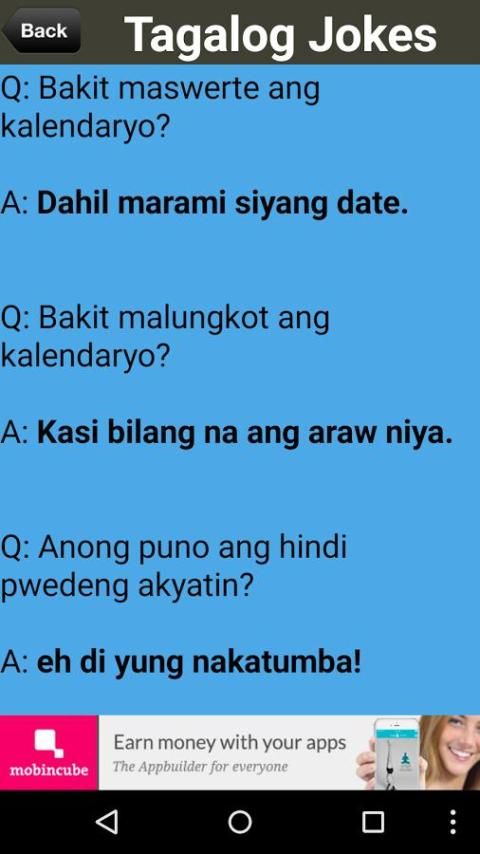 Up to 200+ of jokes and Pick Up Lines to read from. Read, laugh and enjoy this one of a kind entertainment. Different Categories to chose from: Funny English Pick Up Lines, Funny Tagalog Pick Up Lines, English Jokes and Tagalog Jokes. Filipino and others will enjoy this fun experience. Download and use it on your friends, girlfriend/boyfriend or that special someone and share a laugh.