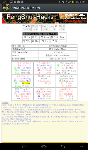 This calculator will calculate the gregorian date & time and generate the appropriate Qi Men Dun Jia chart. In addition, when you touch on the palace, the calculator will automatically analyse the chart formation. The information is presented at the bottom screen.