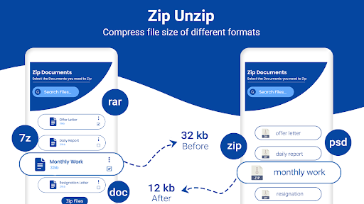 แอพ ZIP ฟรีให้คุณซิปและคลายซิปไฟล์เอกสารไฟล์เสียงวิดีโอและรูปภาพของคุณ แปลงไฟล์ขนาดใหญ่ของคุณเป็นรูปแบบ ZIP ด้วยผู้ผลิตไฟล์ซิปนี้ หากคุณต้องการตรวจสอบไฟล์ zip ที่มีอยู่ในมือถือของคุณด้วยความช่วยเหลือของโปรแกรมดูไฟล์ซิปนี้ - ที่เปิดไฟล์ zip สำหรับ Android คุณสามารถแยกและดูไฟล์ zip, rar การแชร์หรือส่งเอกสารขนาดใหญ่กับผู้อื่นไม่เคยง่ายนัก แต่ด้วยการแยกไฟล์ซิปนี้การบีบอัดกลายเป็นเรื่องง่ายและเรียบง่าย บีบอัดไฟล์ zip หรือไฟล์ rar อย่างรวดเร็วด้วยแอปเปิดไฟล์ unzip zip เนื่องจากแอปพลิเคชั่นนี้เป็นแอพออฟไลน์ดังนั้นจึงไม่จำเป็นต้องมีการเชื่อมต่ออินเทอร์เน็ตหรือ Wi-Fi ในการทำงาน