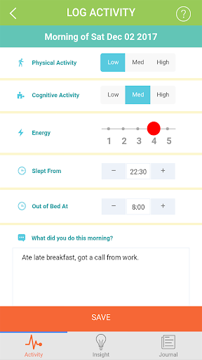 Pace ช่วยให้คุณบันทึกข้อมูลในตอนเช้าบ่ายและตอนเย็นและให้ข้อมูลเพื่อช่วยระบุและสะท้อนให้เห็นถึงกิจกรรมที่อาจหรืออาจไม่ช่วยการกู้คืนของคุณ