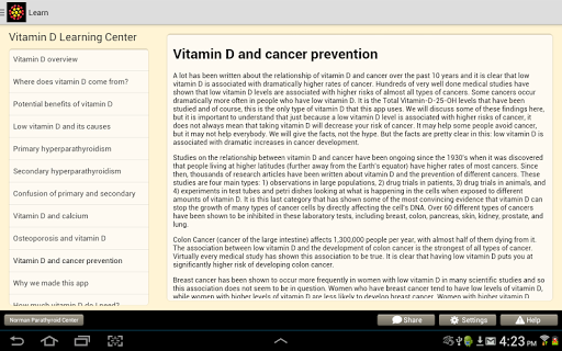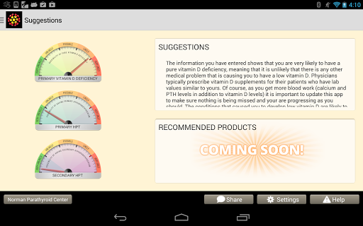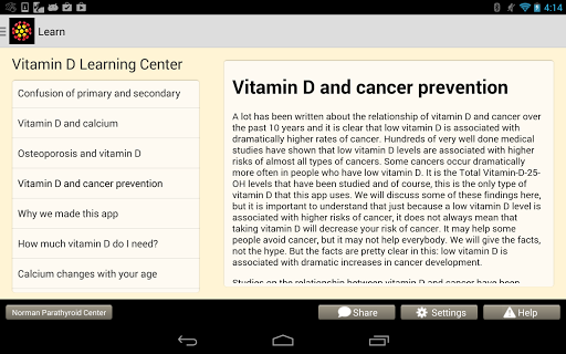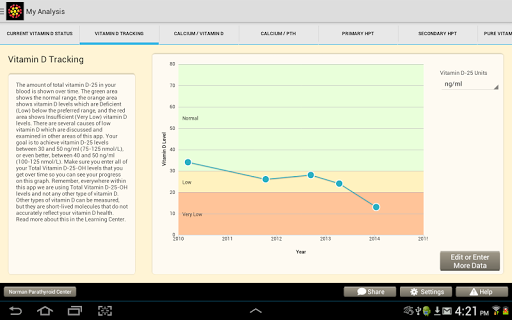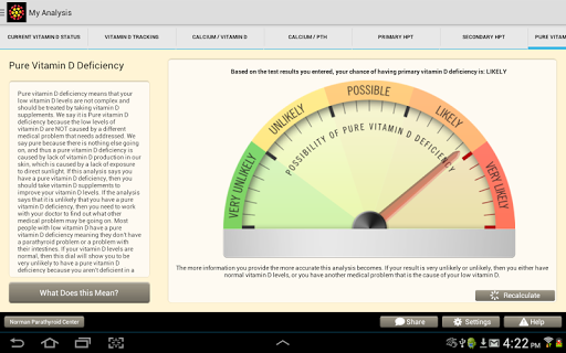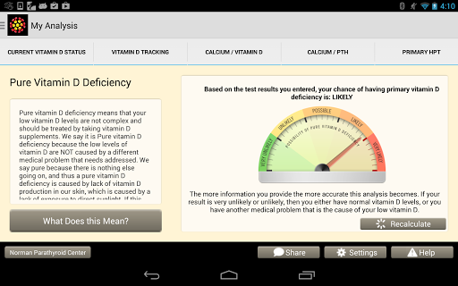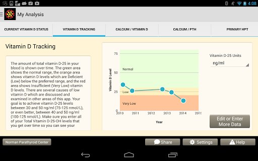 แม้ว่าคนส่วนใหญ่จะมีวิตามินดีน้อยเนื่องจากการขาดการสัมผัสกับแสงแดดบางคนมีปัญหาทางการแพทย์อื่น ๆ ที่ทำให้วิตามินดีน้อยและทำให้การรักษาแตกต่างกันมาก ดังนั้นทุกคนที่มีวิตามินดีน้อยต้องรู้ว่าทำไมพวกเขาถึงมีวิตามินดีน้อยก่อนที่พวกเขาจะทานวิตามินดีแพทย์ผู้เชี่ยวชาญของเราทำแอปนี้เพราะแพทย์ส่วนใหญ่วินิจฉัยปัญหาวิตามินดีไม่ถูกต้อง ผู้ป่วยมักจะใส่วิตามินดีโดยไม่ต้องทำการทดสอบปัญหาอื่น ๆ ที่อาจเป็นปัจจุบันและการคุกคามชีวิต นี่เป็นแอพทางการแพทย์ที่สามารถทำให้คุณรู้สึกดีขึ้นและช่วยชีวิตคุณได้ดีขึ้น อย่างไรก็ตามมันใช้งานง่ายและทำให้การเรียนรู้สนุก! - แอพได้รับการออกแบบให้ใช้งานโดยผู้ป่วย แต่แพทย์หลายคนใช้ในการฝึกฝนเช่นกัน แบบฟอร์มการป้อนข้อมูลที่ใช้งานง่ายส่งผลให้กราฟที่สวยงามที่ทำให้ปัญหาทางการแพทย์ที่ซับซ้อนเข้าใจง่ายและตัดสินใจเกี่ยวกับวิธีการก้าวไปข้างหน้าง่าย ห้องสมุดการเรียนรู้ได้อ่านบทความที่เขียนโดยแพทย์ผู้เชี่ยวชาญง่าย ๆ ร้านค้าจะทำการแนะนำวิตามินดีและแคลเซียมที่เฉพาะเจาะจงสำหรับคุณตามการตรวจเลือดและการวิเคราะห์ของคุณ ผู้ใช้เกือบทั้งหมดของแอพจะเข้าใจปัญหาวิตามินดีดีกว่าแพทย์ แต่มันจะช่วยให้คุณพูดถึงปัญหาเหล่านี้กับแพทย์ของคุณเพื่อให้คุณสามารถวางแผนที่สมบูรณ์แบบสำหรับคุณ เราจะช่วยคุณและแพทย์ของคุณเดาว่าการทำงานของวิตามินดีและปัญหาแคลเซียม