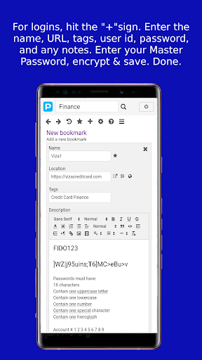 เป็นตัวจัดการรหัสผ่าน - Passfindr ช่วยให้คุณป้อนข้อมูลรับรองการเข้าสู่ระบบของคุณสร้างรหัสผ่านที่แข็งแกร่งด้วย คลิก. สร้างรหัสผ่านที่กำหนดเองตามข้อกำหนดของเว็บไซต์ของคุณ ป้อนบันทึกโดยไม่มีข้อ จำกัด ที่เกี่ยวข้องกับเว็บไซต์ที่คุณเข้าสู่ระบบ