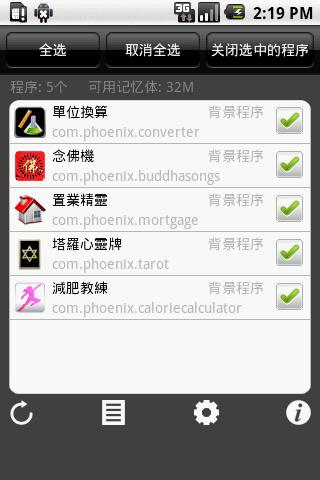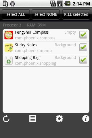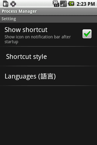 Kill all running app with just one click.Help you free memory to run other apps and Save power.Simple and Easy user interface.Stylish quick launch icon suits your htc Google phone.Features: Manage running apps easilyYou can open, uninstall, kill, or view detail of the running app by a long press. Quick launch iconHTC style or Google style quick launch icon will show on the status bar Screenshot 1 amp; 2 Ignore listProcess Manager won39;t kill apps in this list. Multi language supportEnglish or Chinese, choose from your locale automatically.Tags: HK, TW, CN, Hong Kong, Taiwan, China, , , , taskiller, advanced task killer, , , , process manager, uninstall,