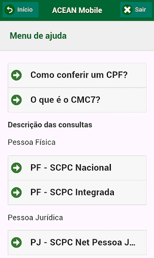 O aplicativo possui opções para Pessoa Física, Pessoa Jurídica, Cheque e Veículos. Possui um help com informações sobre cada tipo de consulta e também consulta à situação cadastral na base de dados da receita federal para CPF e CNPJ. Ao final de cada consulta é emitido um número de resposta, que poderá ser consultado posteriormente através do Sistema de gerenciamento da Entidade.