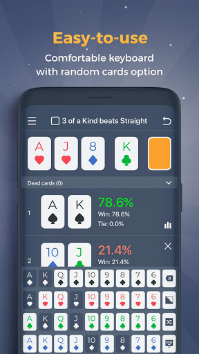 > แป้นพิมพ์ - แป้นพิมพ์ที่ใช้งานง่ายที่ออกแบบมาสำหรับการเลือกการ์ด ช่วยให้คุณเห็นการ์ดที่ไม่ได้เลือกไพ่ที่เลือกและการ์ดที่ตายแล้ว ชุดผู้เล่นและการ์ดชุมชนได้อย่างง่ายดาย แป้นพิมพ์ยังช่วยให้คุณสร้างการ์ดสุ่ม