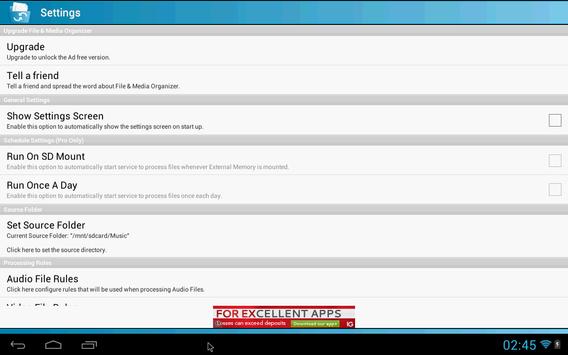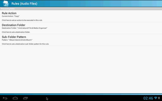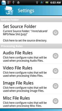 File & Media Organizer has the ability to run automatically on a scheduled basis to organize those multitude of files on your device so you don't ever have to. Whether its music, videos, documents or any other file type, File & Media Organizer will get the job done for you.