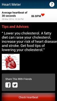 Heart Meter checks your heart rate (beats per minute) and let's you keep a track of your fitness and general well being.