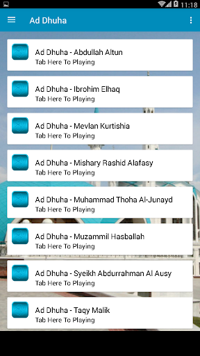 Cette application Ad Dhuha est une application simple présentée pour écouter Surah Ad Dhuha en format Mp3 hors ligne. Vous n'avez pas besoin d'une connexion Internet pour l'écouter, il vous suffit de l'installer en premier. Sourate Ad Dhuha est lu à voix haute par Qori Mishary Rashid Alafasy, Muhammad Thoha Al-Junayd, Al Sudais, Abdullah Altun, Ibn Elhaq, Mevlan Kurtishia, Muzammil Hasballah, Cheikh Abdurrahman Al Ausy et Taqy Malik.