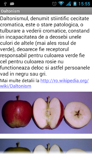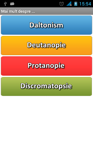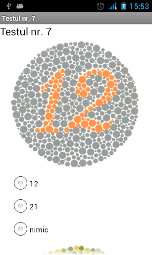 Aplicatia va ofera teste ce determina daca distigneti corect culorile. Atentie : Orice rezultat dat de aplicatie este pur orientativ. Pentru un rezultat concludent consultati un medic oftalmolog.