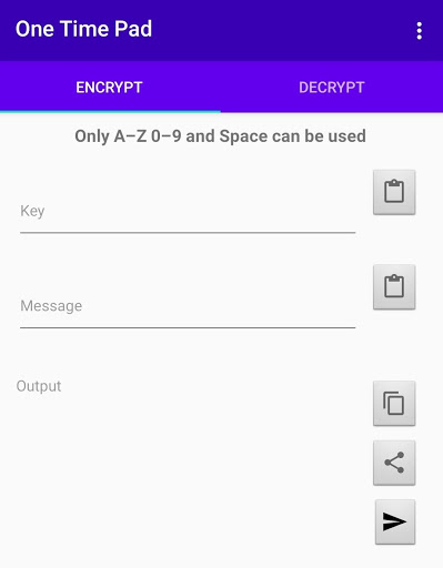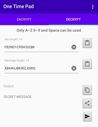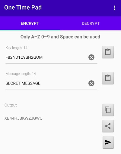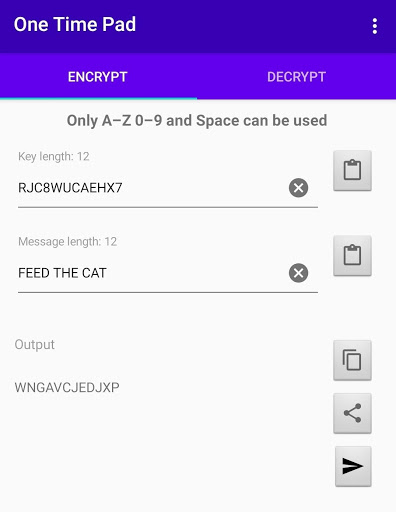 คุณสามารถแบ่งปันข้อความที่เข้ารหัสของคุณผ่านข้อความอีเมลข้อความโดยตรง, หรืออัปโหลดไปยัง onetimepad.app