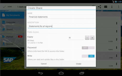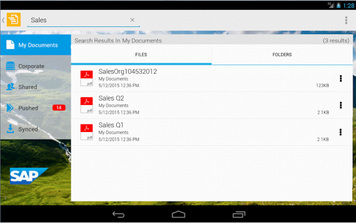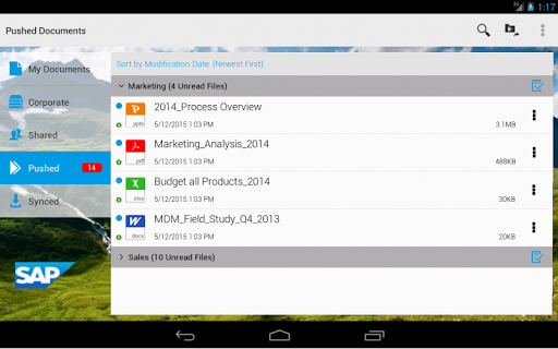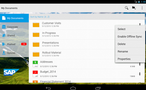 The SAP Mobile Documents mobile app for Android lets you securely bring all your personal and business documents and content with you wherever you go. Unlike manual file transfers using shared folders or e-mail, this app enables you to quickly and easily access and collaborate on files from your computer and corporate document management systems anywhere, anytime.