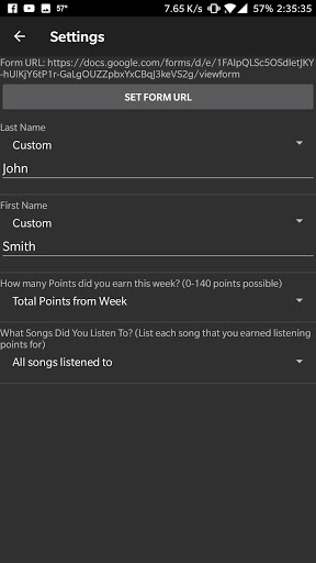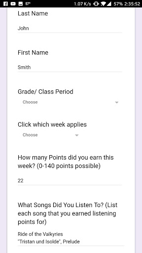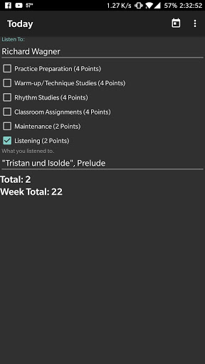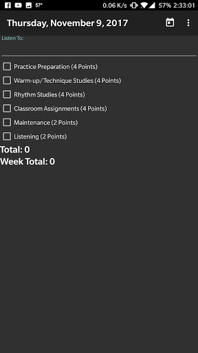 This app allows you to track your practicing on a daily basis! It also automatically fills in the google form which is used to turn the practice cards in! All you have to do is go to settings and set the url and what you want the entries to contain!