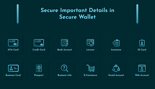 - เพิ่มข้อมูลส่วนบุคคลของคุณไปยังบัตร ATM ของคุณ , บัญชีธนาคาร, บัตรเครดิต, บัตรประจำตัวประชาชน, ใบอนุญาต, บัตรหนังสือเดินทาง, นโยบายการประกันภัย, บัญชีอีเมล, ธุรกิจ การ์ด, อีคอมเมิร์ซ, บัญชีเว็บ, ข้อมูลธุรกิจที่นี่และเก็บข้อมูลที่ปลอดภัย