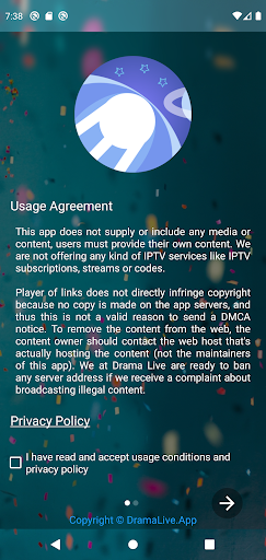 แอปพลิเคชันไม่ได้โฮสต์ไฟล์วิดีโอหรือการถ่ายทอดสดบนเซิร์ฟเวอร์ของแอปพลิเคชันที่ไม่ได้ประกาศว่าเป็นเจ้าของหรือรับผิดชอบเนื้อหาที่ผู้ใช้ทำงานในแอปพลิเคชัน และแอปพลิเคชันเมื่อเริ่มต้นมันฟรีของเนื้อหาใด ๆ เว้นแต่ผู้ใช้จะเข้าสู่เนื้อหาของตัวเอง