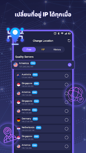 แอพนี้ให้คุณเปลี่ยนที่อยู่ IP ของคุณอย่างรวดเร็วและง่ายดาย มอบความเป็นนิรนามทางออนไลน์ระดับสูงสุดให้กับคุณ สิ่งนี้ให้การป้องกันเพิ่มเติมทางออนไลน์เนื่องจากทำให้แฮ็กเกอร์และผู้ประสงค์ร้ายรายอื่นติดตามกิจกรรมทางอินเทอร์เน็ตของคุณได้ยากขึ้น