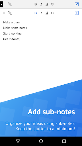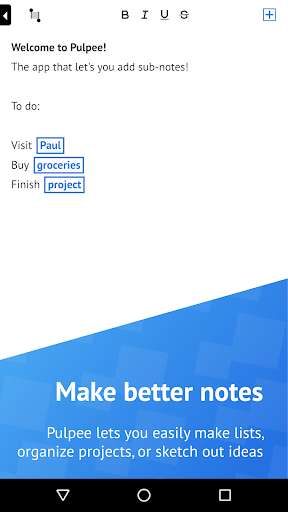 Pulpee is a simple note taking app with a powerful twist. With Pulpee, you can add Sub-Notes, which allow you to add details, sub-lists, or addresses to your notes.