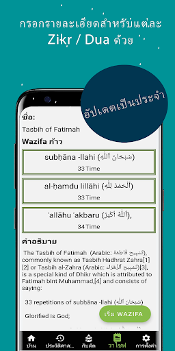 (تسبیحةالزھراء / تسبیح فاطمہ الزھرا). สำหรับแต่ละขั้นตอน (tasbih) ใน wazifa (ลำดับ tasbeeh) จะแสดงข้อความให้ท่องและทำซ้ำเพื่อทำให้ลำดับ tasbih ที่ซับซ้อนเป็นเรื่องง่าย