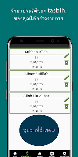 • ผู้ใช้ยังสามารถบันทึกค่าการนับ tasbih สำหรับ tasbeeh ปัจจุบันได้ด้วยตนเองโดยกดปุ่มบันทึกที่มุมบนขวาของหน้าจอเพื่อบันทึกในส่วนประวัติพร้อมวันที่และเวลา